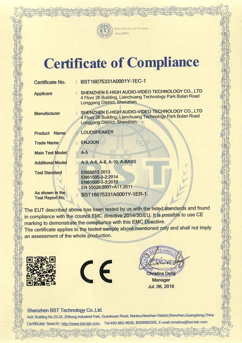 通過(guò)CE認(rèn)證的產(chǎn)品包括A-3、A-5、A-6、A-8、A-10,以及有源低音揚(yáng)聲器A-BASS。