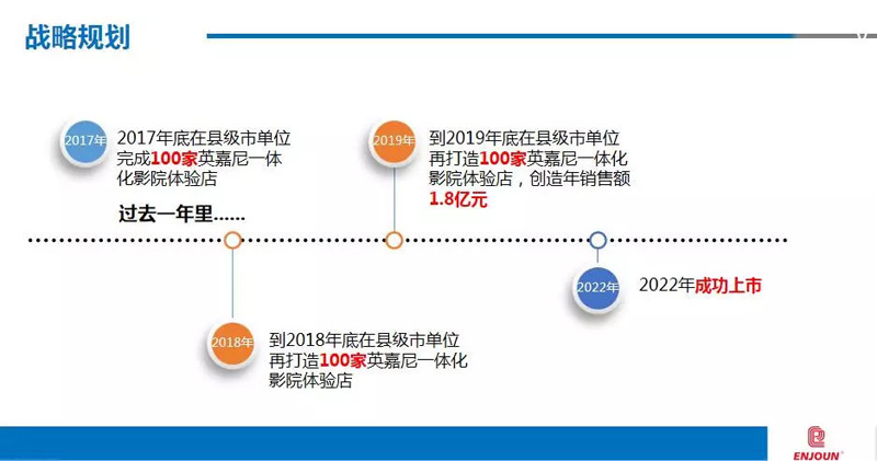 中國現(xiàn)有地級市共計 280 多個,縣級行政單位 2862 個,英嘉尼目標到2019年底在縣級市單位建立 300 家英嘉尼影院體驗店,目標年銷售額實現(xiàn) 1.8億 ,目標到2022年實現(xiàn)上市。