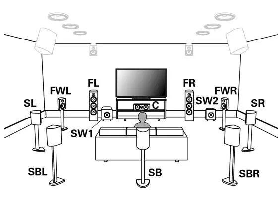 3、在9.1系統(tǒng)的基礎(chǔ)上,增加2個頂部揚(yáng)聲器(9.1.2)
